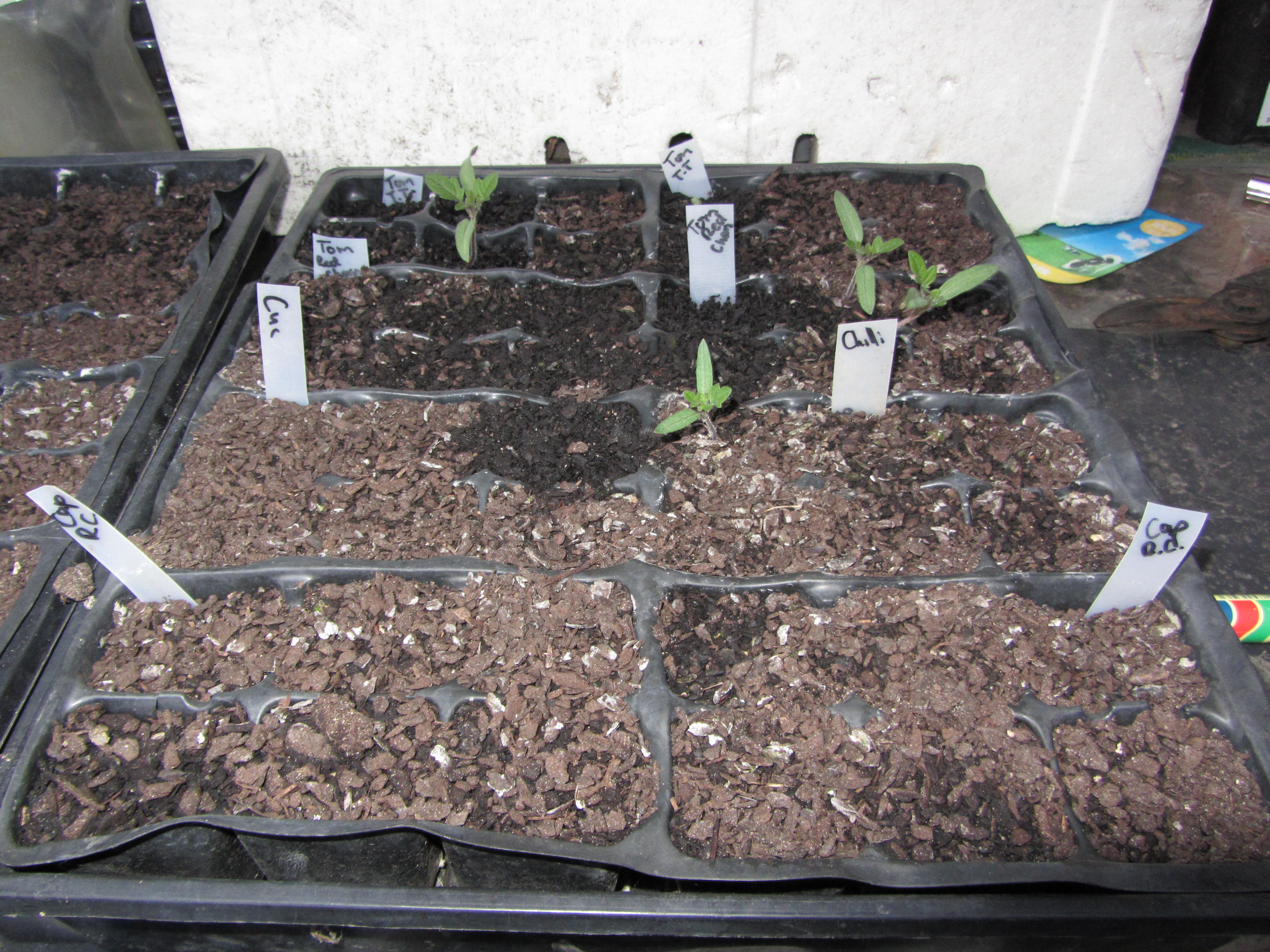 I plant seeds in a standard, seed raising punnet in seed raising mixture. This is just loose and generally fairly benign stuff as the seeds actually have all they need already. One of the big tips is don’t plant too deep. The rule that I follow is no more than twice their diameter deep. The great thing about having this so close to the back door is it’s easy to remember to give them a little water every time I come in and out as they shouldn’t be allowed to dry out (and yes I watered them after taking the photo!). You’ll notice the little tags, these are really important as I tend to forget what I’ve planted.