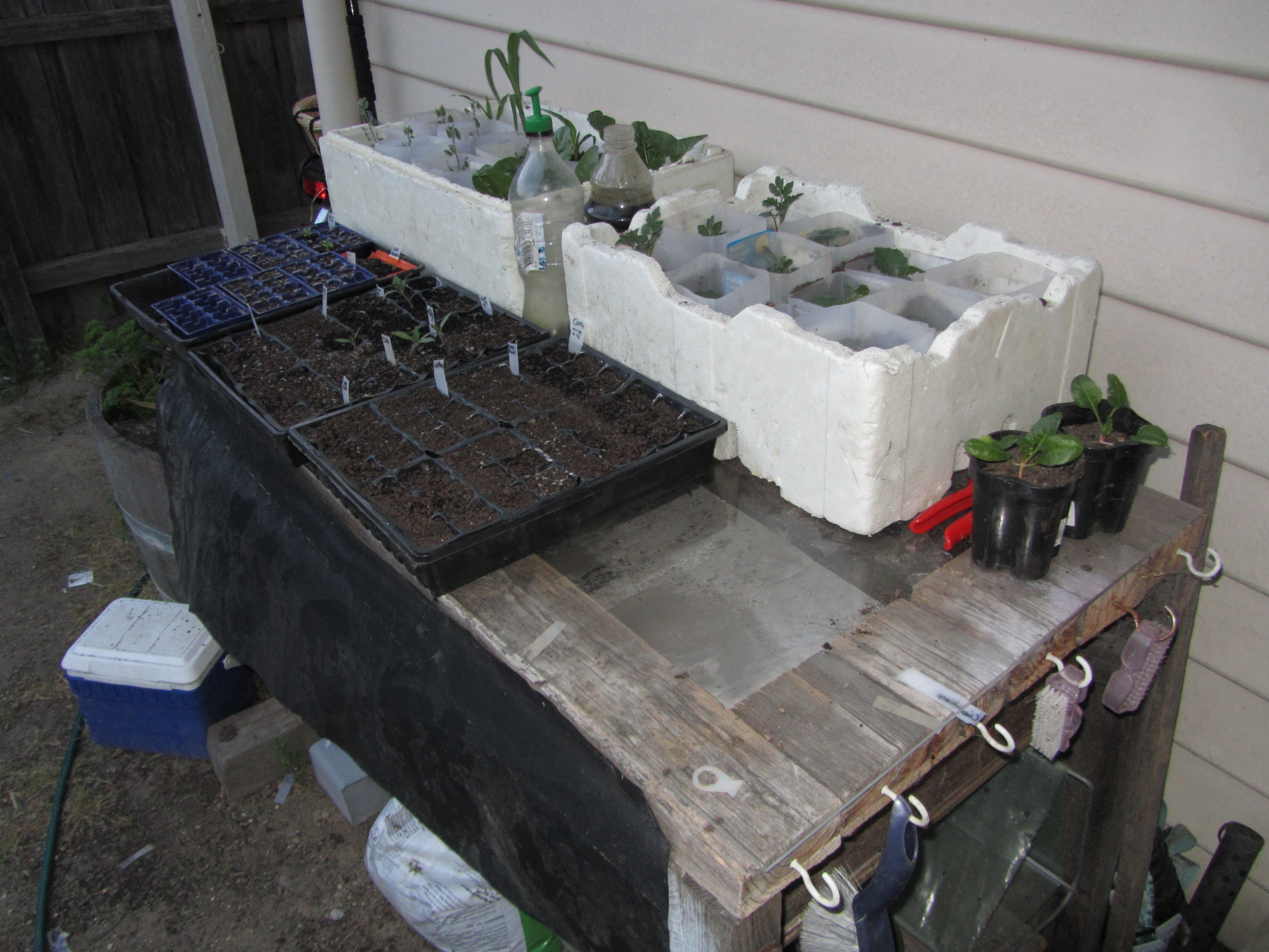 Just a final picture to show that the bench that I do this on, that sits right by the back door, is actually an old workbench that was left in the garage when we bought the place. I took a jigsaw to it and cut the top out, built a platform underneath which I lined with bits of polystyrene that I found for insulation and then covered it with a layer of heavy duty Perspex. This makes it a table when we want one and also a little greenhouse when things get cold.