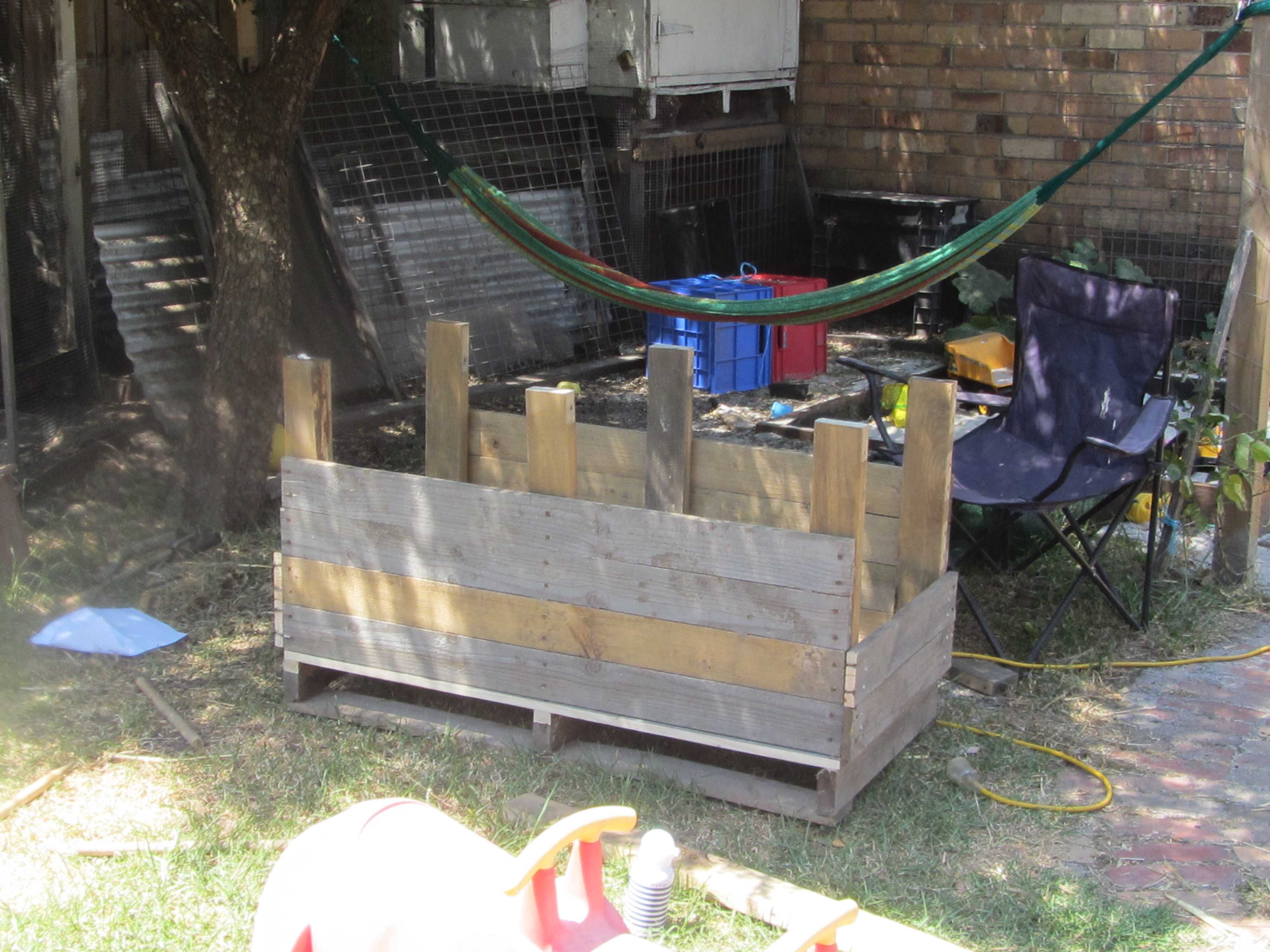 The next step (and the next installment in this story) will be to actually make this into a wicking bed. I’m also going to restore a fairly sad looking 1/2 wine barrel as a wicking bed as a test case. The grand finale will be a street wide box building as part of our nature strip greening. We’re tossing up with the concept of digging down about 20cm and then just building hollow wooden rectangles to save on use of pallets, given the number of boxes we’re aiming to build. These will then go on top of the holes to make the whole 60cm bed. Whilst this will be a lot more digging it will mean that we would only need one pallet per box.