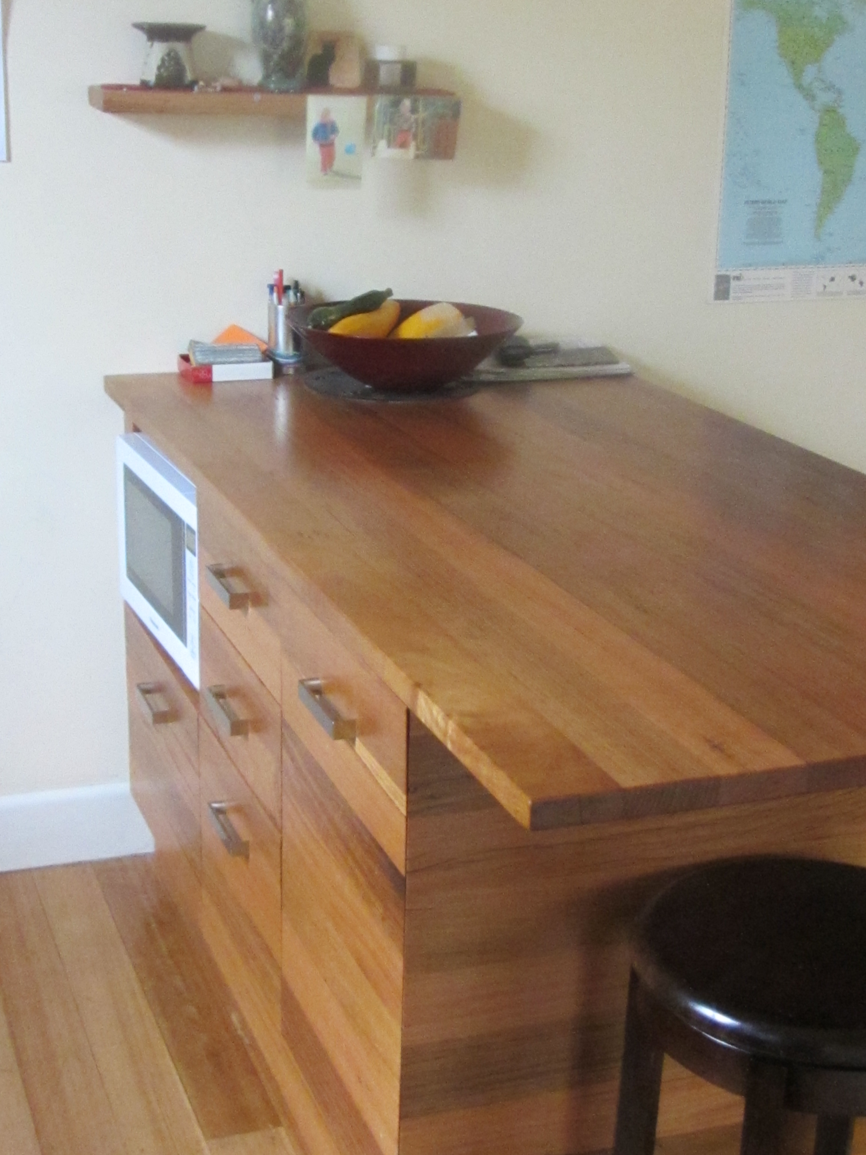 One of the coolest things that we had never really intended to do came about after realising that the wood that was being taken out of the old internals was not only high quality hardwood and but also had spent 50 years or so drying and hardening in our walls. The builder told us that most just throw it away but that we could cut it up for firewood . This seemed a total waste of good wood. With this in mind we were rapt when we discovered an enthusiastic and ever so slightly chaotic Italian carpenter around the corner. We explained or situation, he came over took the wood that I had painstakingly de-nailed and left with about 4 measurements written on the back of an envelope and a promise that he would get back to us. No money had changed hands, we had just explained that we wanted a kitchen bench and he excitedly took it from there. A number of weeks passed and we assumed that maybe chaos had won and that would be the last we saw of Mr. U. But no, a few week more we heard from him, the bench was finished and he would bring it in, along with a couple of shelves he had made with some off cuts.