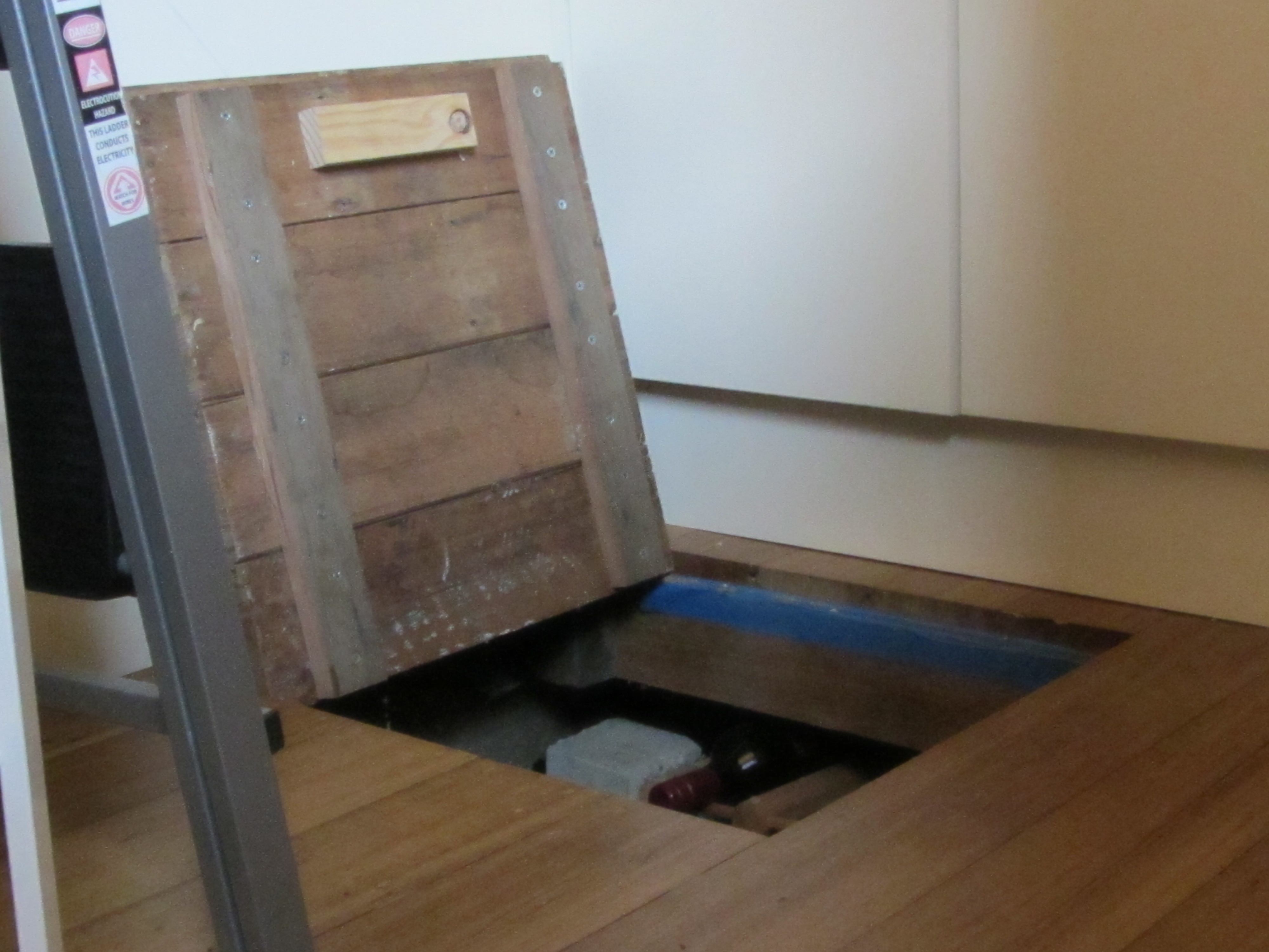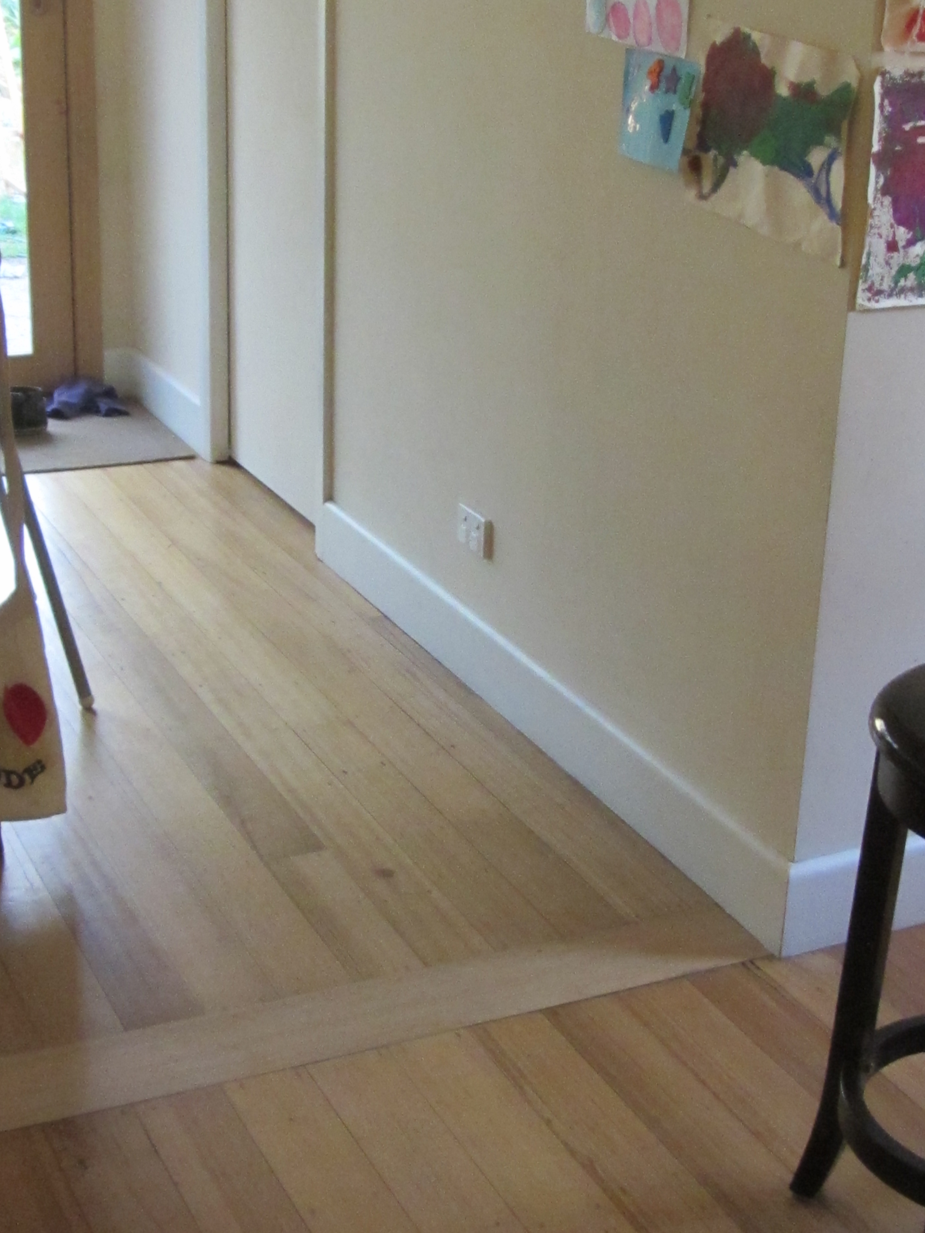 We re-used the old floorboards and filled the gaps with reclaimed boards and were quite chuffed when the man who sold us the boards explained that the workable wood amount of modern boards is about 18mm whereas our 23 mm boards would give us the capacity to strip, sand and reseal a number of times. I also have to hand it to the builder who came up with many an ingenious solution to match not only different boards but also different levels throughout the back. He also cut a section out of the panty boards to give us a cool and dry ‘cellar’ under the house.