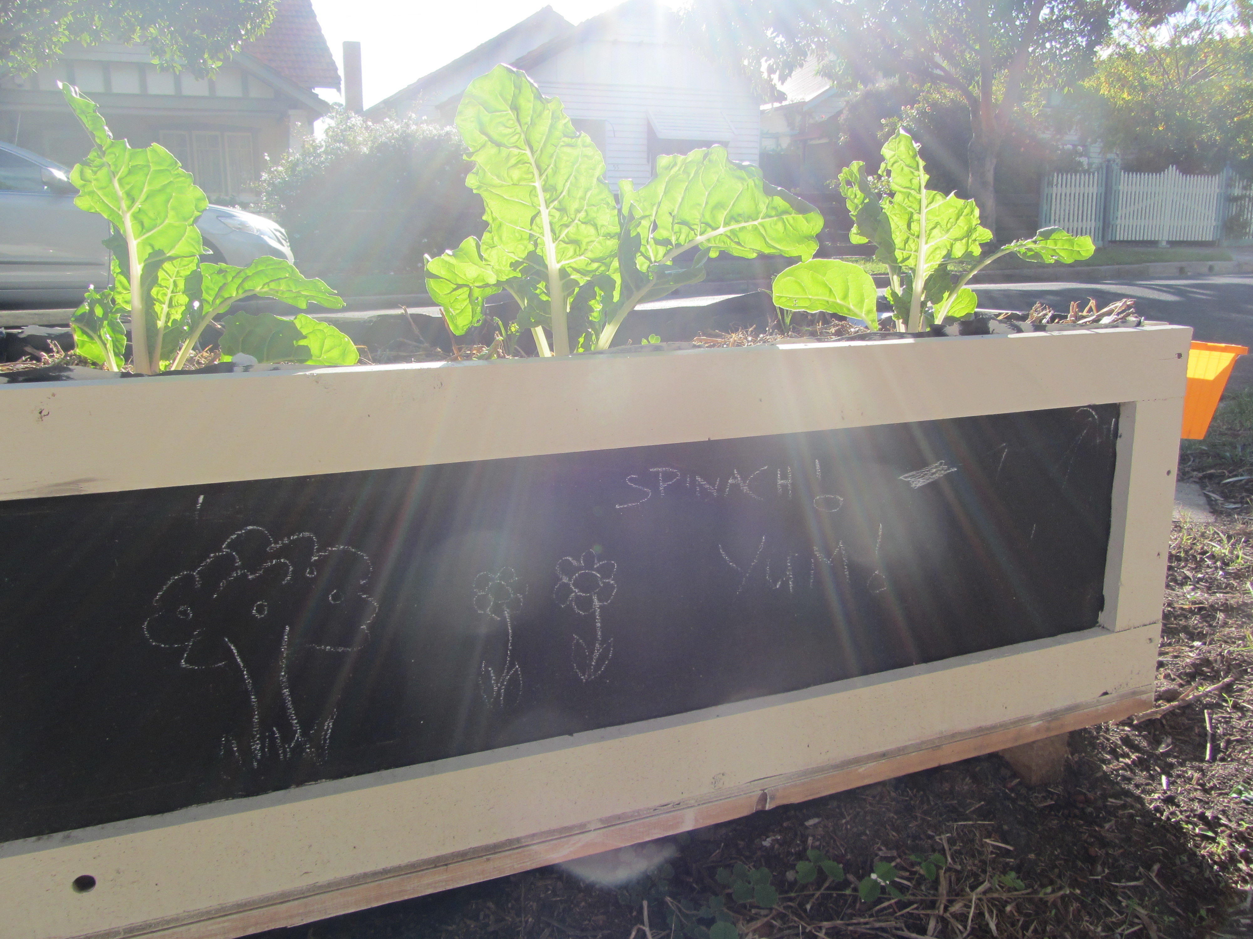 silverbeet is growing really well and has started vanishing from the nature strip and the radishes are just starting to poke their heads up. The blackboard has also been a hit. Not only do local kids love drawing on it but we had a neighbour refill the chalk box and leave us a little message. It was also great to get a thankyou on it after we shared about 12 litres of ‘worm wee’ fertilizer and left some instructions on the box about how to use it. The mix of art and growth just seems to really work.