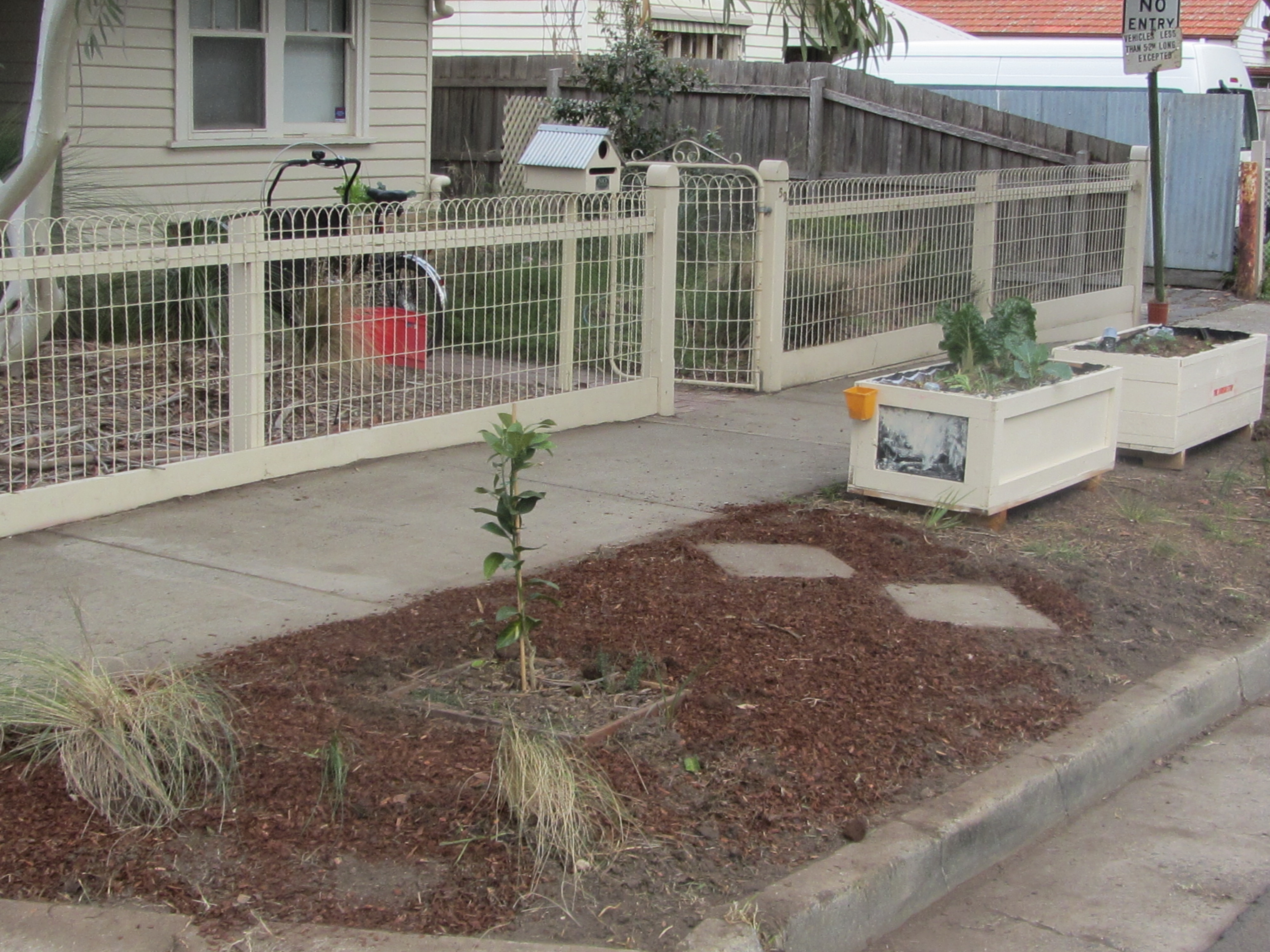 Our inspection occurred and Darebin council were pretty positive about what we have done. We have to jump through some paperwork hoops and notate everything we’ve done but it’s pretty exciting that they have not only provisionally approved what we have done but also want to promote this as good practice. We spent the weekend digging up the last of the grass, planting more natives and spray painting the logo’s on the boxes. We also started covering the ground in mulch, though this is quiet slow since it’s happening one cargo bike load at a time. I think it looks great though.