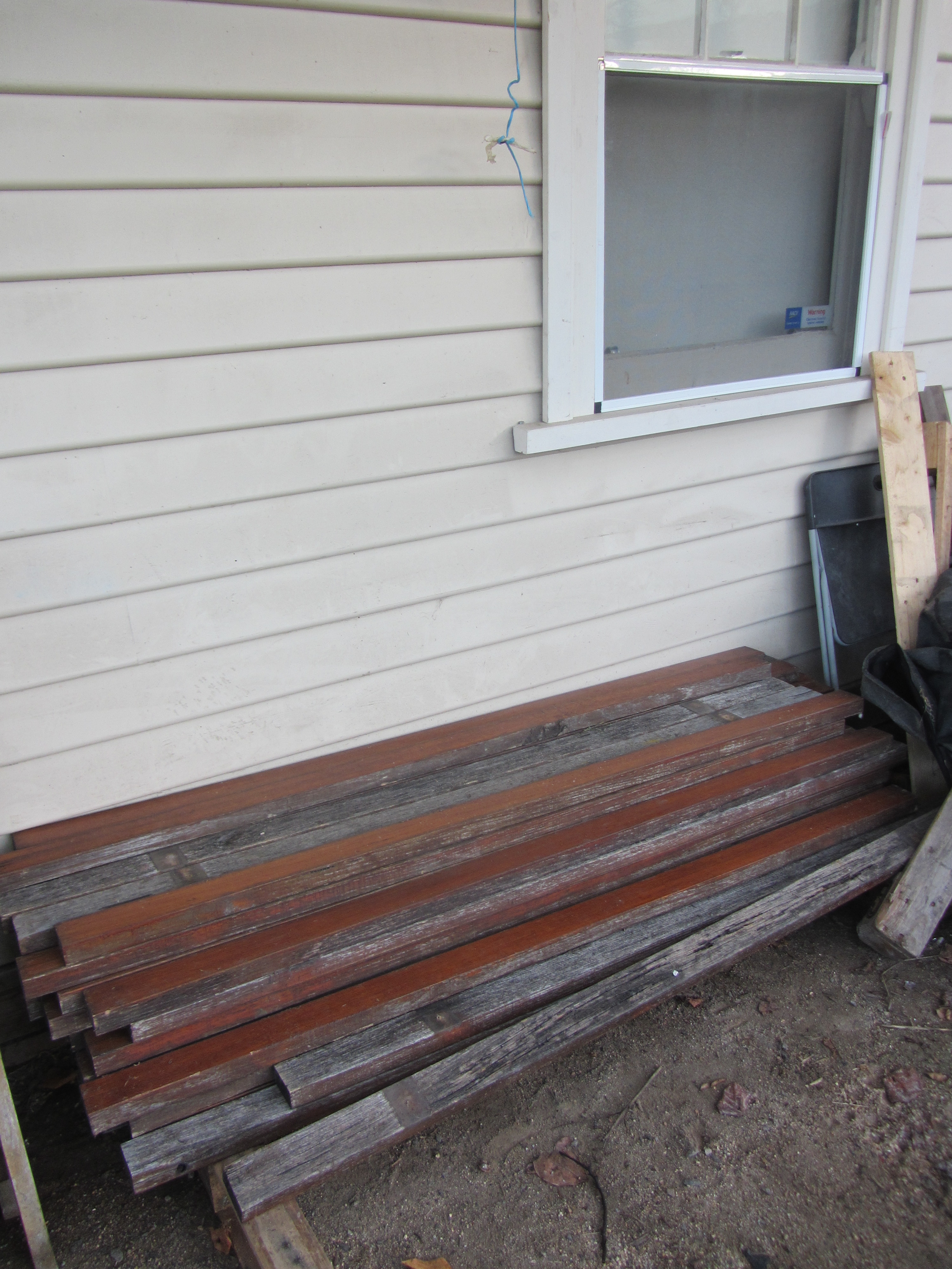 the pallets but the idea of using new wood, whilst convenient just seems wrong. So I was pretty pleased when our next door neighbour called. Turns out that that he had been employed to pick up 60 odd hardwood timbers. Thinking that this is the sort of thing that we might be interested in he thought he’d give us first refusal. Did we want it, well at about an hour per 8 or so planks, what do you think? So we quickly snaffled them and now we’re into full box swing with the first to be placed on a nature strip in the next couple of days.
