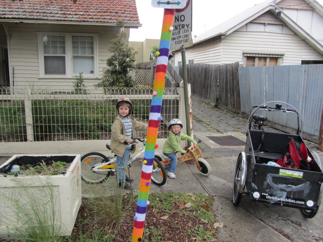 The two shops that we do most of our shopping from are close by soIMG_1277 it’s  helmets bikes and convoy style (incidentally how do you like the yarn bombing that appeared on street signs down a couple of weeks ago?).